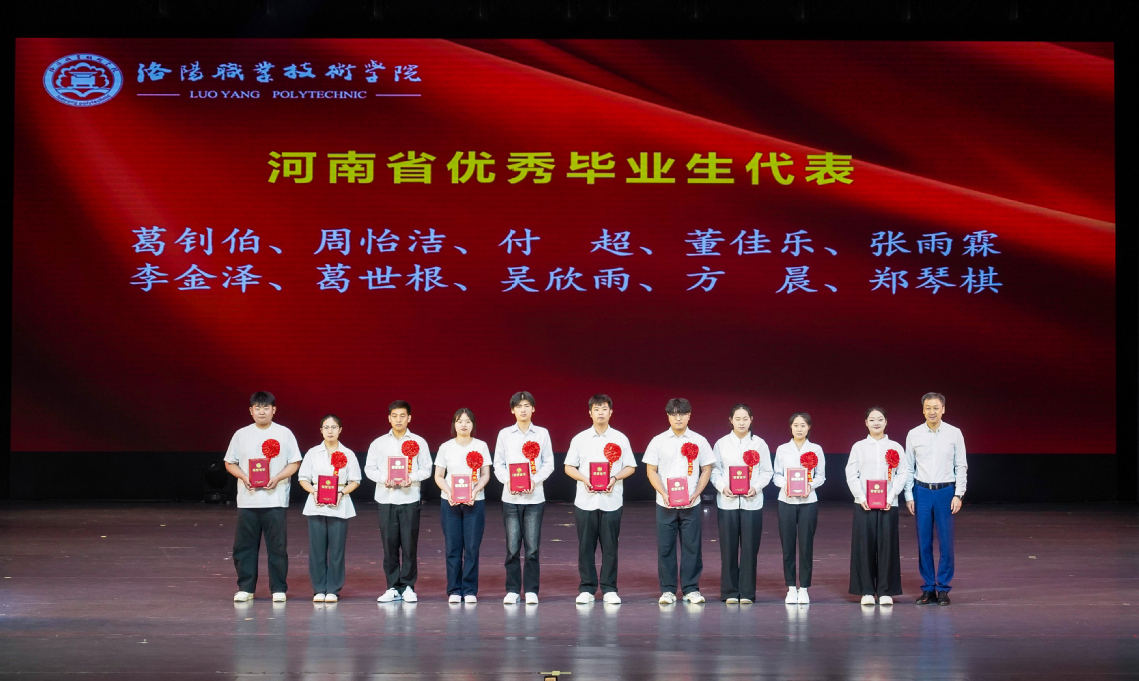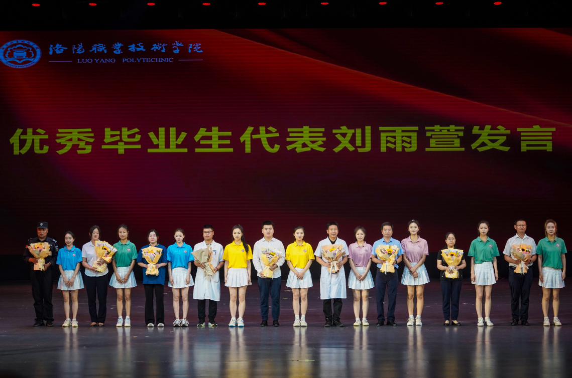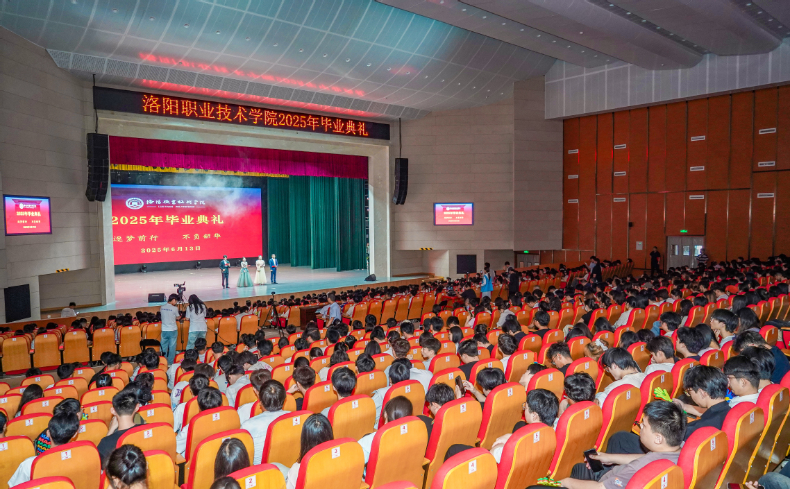 毕业典礼上,师生代表送上了精彩的文艺演出。舞蹈《燃动青春》中,学生们用欢快的舞步,表达了对毕业生的深情祝愿;毕业视频《致我们闪耀的青春》,用一幕幕画面回忆了2025届学生在校的点点滴滴;师生舞台剧《青春有你,一路向光》,老师学生同台表演,表达了对大学生活的不舍和对未来生活的向往;校园原创音乐剧《再见,妈妈咪呀》,学生们用生动活泼的形式,表达了洛职学子的青春担当。