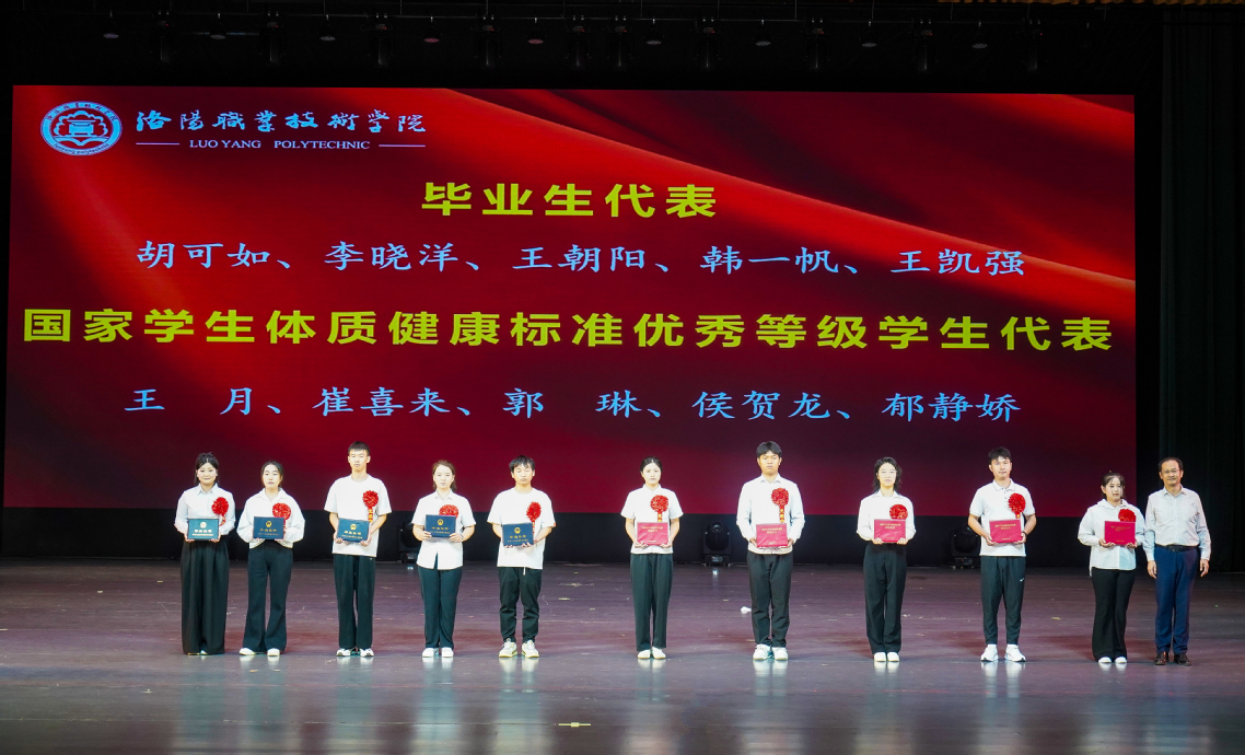 党委书记赵健出席毕业典礼并为河南省优秀毕业生代表颁发荣誉证书,校长李保安向毕业生寄语并为毕业生代表颁发毕业证书和国家学生体质健康标准等级证书。