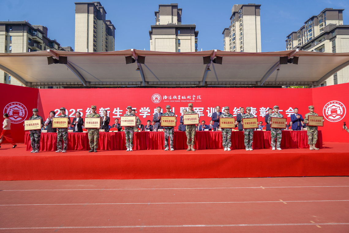 中国人民解放军95827部队上尉战勤参谋刘宇宣读军训先进连队、军训先进教官和优秀学员表彰文件。先进集体代表和先进个人依次登台领奖。校领导分别向各承训单位赠送锦旗。2025级新生代表、2024级学生代表、教师代表、新生家长代表分别发言。