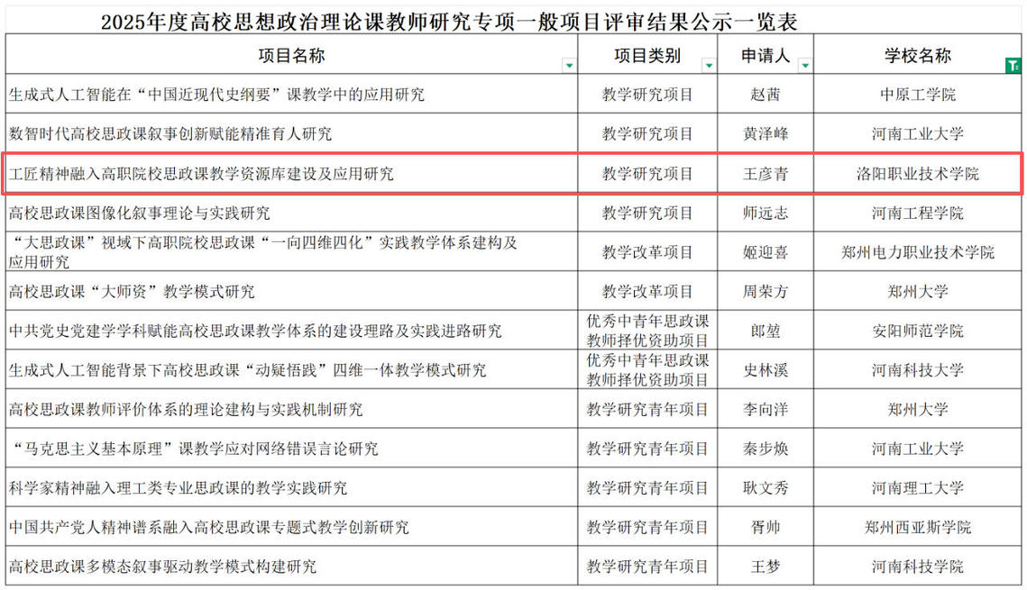 近日,教育部社会科学司公布了2025年度高校思想政治理论课教师研究专项一般项目评审结果。问鼎在线项目“工匠精神融入高职院校思政课教学资源库建设及应用研究”成功入选一般项目类别,成为全省高职院校唯一入选项目。